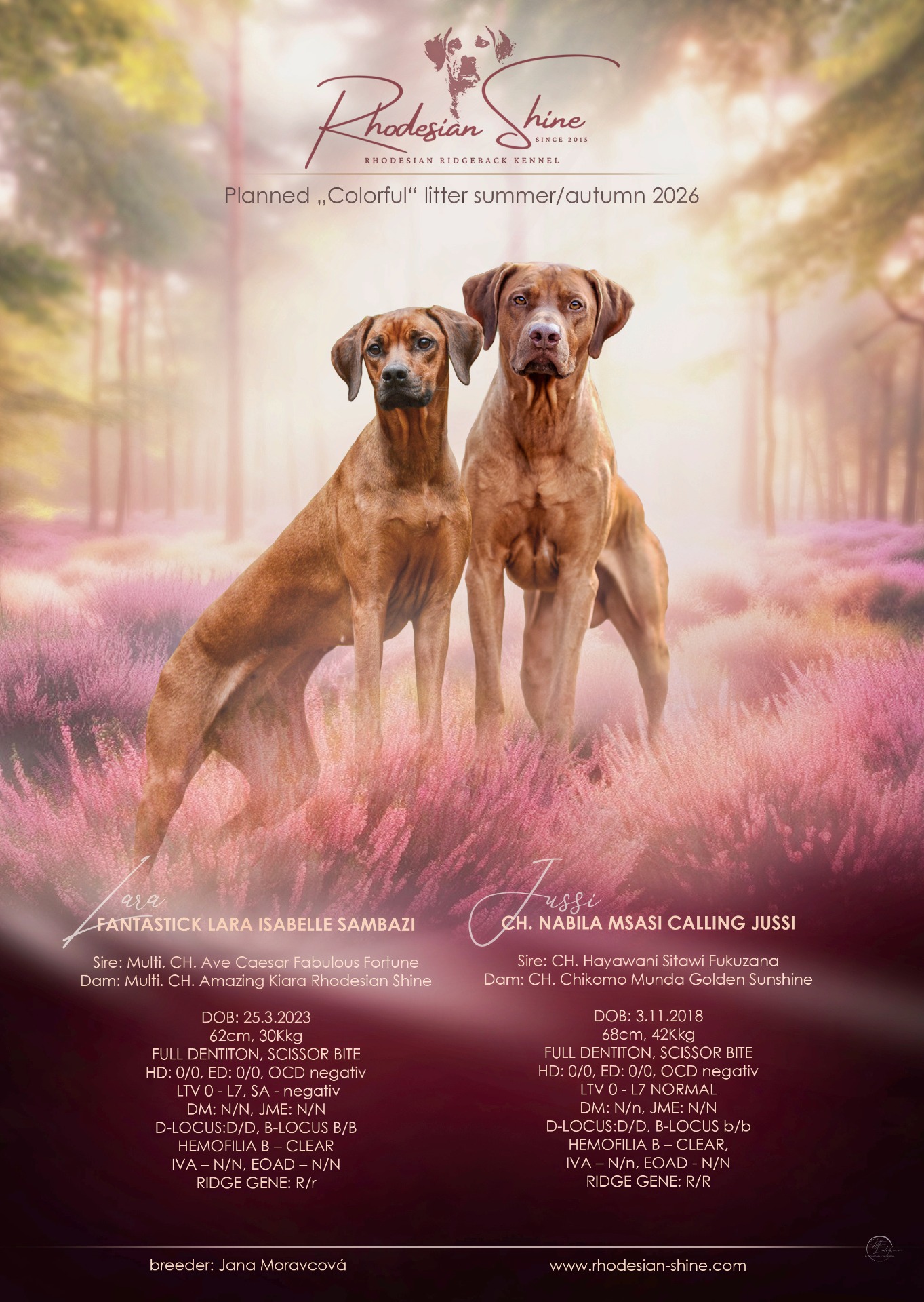 Rhodéské ridgebacky chováme už od roku 2007, chovatelskou stanici Rhodesian Shine jsme oficiálně založili v roce 2015. Prozatím jsme odchovali dva vrhy krásných a zdravých štěňátek.